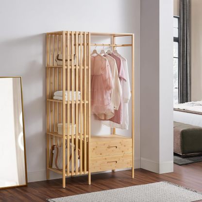 en.casa Perchero Burro con 2 Cajones y 4 Estantes Laterales de Rejilla Soporte de Ropa 185x100x45 cm Estilo Moderno Óptima Ventilación para Dormitorio Recibidor Oficina Bambú - Natural
